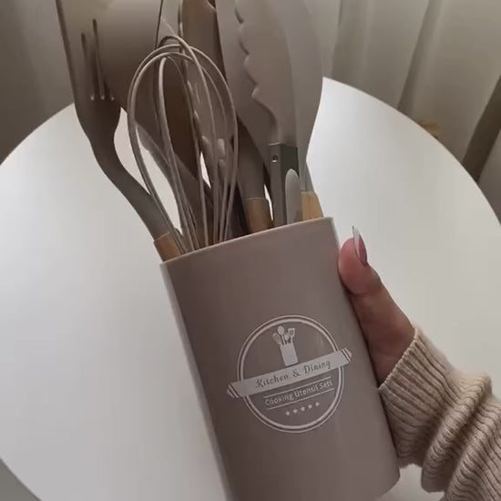 12-Piece Set Silicone Kitchen Tools Heat Resistant Non-Stick Cooking Spatula Spoon Wood Handle Storage Bucket Cooking Accessorie